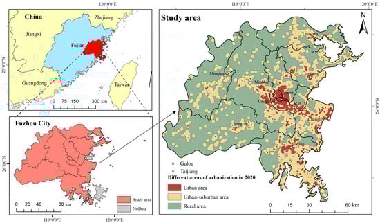 Figure 1 shows our study area. Some island areas, such as Pingtan Island, were excluded due to missing data. Drawing on the principle that building coverage decreases from downtown in urban areas to suburban and rural areas [40], we divided the study area into three categories (i.e., urban, urban–suburban, and rural areas) based on the coverage ratio of the building area. The steps for dividing the study area are as follows: First, a 900 m moving window [41] was used to calculate the coverage ratio of the building area (construction land) every five years from 2000 to 2020. Combined with the results of dividing it into three categories by the natural discontinuity method, the area with a proportion greater than or equal to 40% was considered urban. Secondly, considering that the distribution of buildings in urban–suburban areas was more widely scattered than in urban areas, the area with a ratio greater than 0 and less than 40% and its 600 m buffer zone was considered an urban–suburban area. Finally, the remaining areas were viewed as rural areas. The rationality of the classification results will be tested in subsequent experiments. Figure 1 shows the divisions of our study area in 2020.