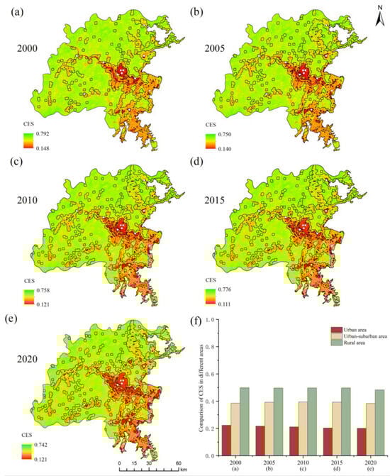 From 2000 to 2020, the spatial distribution of CES showed heterogeneity, with significant changes along the urban–rural gradient (Figure 4). From 2000 to 2020, the spatial distribution of CES showed heterogeneous characteristics: Low-CES areas were primarily concentrated in urban areas, while High-CES areas were mainly concentrated in rural areas. Some spatial spillover phenomena could also be detected in the low-CES areas. In addition, the average CES illustrated an increasing trend from urban to suburban and rural areas. This may be because buildings with low ecosystem service benefits dominate land use in urban areas. However, there were fewer buildings in suburban and rural areas [37], and the landscape is mainly composed of cultivated land, grassland, and woodland with high ecosystem service benefits [51]. This finding is consistent with the results of [26,33].