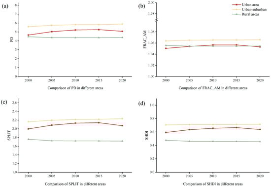 Comparison of average (a) PD, (b) FRAC_AM, (c) SPLIT, and (d) SHDI in different areas from 2000 to 2020.
