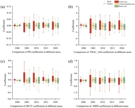 Figure 6 shows the impacts of four LPIs in different areas. The impacts of LPIs in urban–suburban areas were relatively low, especially significantly lower than those in urban areas. The impact of LPIs in urban–suburban areas increased from 2005 to 2010 and 2020, while the effect was the opposite in 2015. Among all LPIs, the SPLIT had a relatively more prominent negative impact on CES in urban–suburban areas. Specifically, the impact of each LPI on CES was as follows: