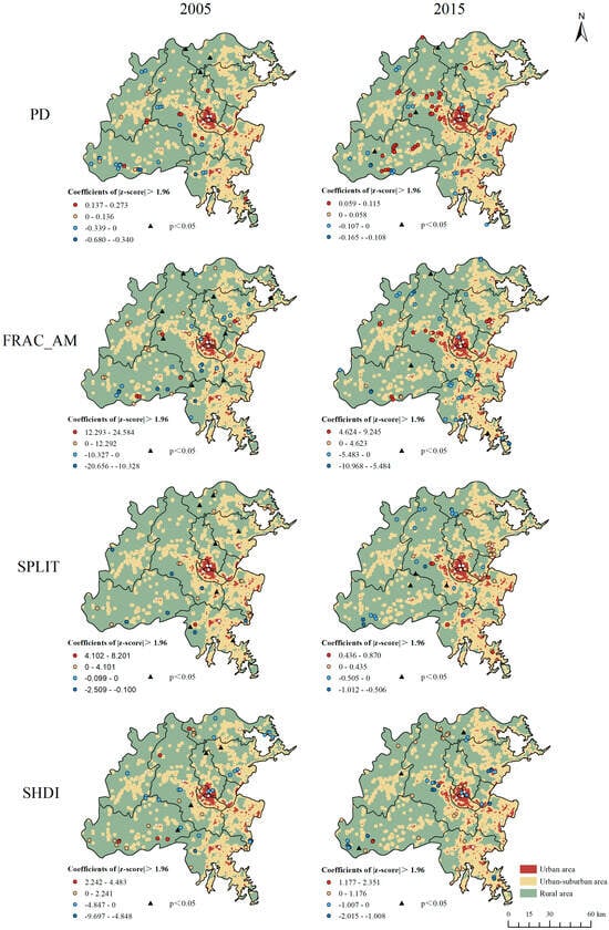 Figure 7 shows the spatial distribution of the significant coefficients of LPIs in 2005 and 2015. Interestingly, the substantial impacts of LPIs on CES are primarily concentrated in urban–suburban and rural areas, especially at many significant points close to the urban–suburban boundaries. This also indicated that as urbanization expands, the change in urban–suburban areas plays an essential role in the impact of LPIs on CES. Specifically, in 2015, the number of significant PD coefficient points increased, with positive coefficients mainly concentrated close to the urban–suburban boundaries or rural areas. The negative significant coefficients were primarily focused in the east regions close to the urban area, indicating that the urbanization expansion may cause an increase in PD, thus resulting in negatively affected CES. The negative significant coefficients of FRAC_AM were mainly concentrated at the urban–suburban boundaries of the northwest and southwest areas. The positive significant coefficients were focused on the central regions. Significant SPLIT coefficients increased in 2015, with negative coefficients primarily distributed in the western rural areas with large landscape patches and positive coefficients concentrated in the eastern regions closer to the urban area. Significant negative SHDI coefficients were primarily focused in the central area near the urban areas. SHDI-positive coefficients were mainly distributed in the northern and southern areas near the urban–suburban boundaries.