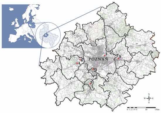 Poznań metropolitan area with the six case studies selected. 1: Case Study 1 (Zawady, Poznań); 2: Case Study 2 (Lubonianka, Luboń); 3: Case Study 3 (Cegielskiego Estate, Swarzędz); 4: Case Study 4 (Kolejowa Street, Dąbrówka); 5: Case Study 5 (Rynek, Puszczykowo); 6: Case Study 6 (Grafitowe Estate, Skórzewo).