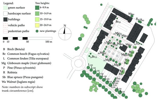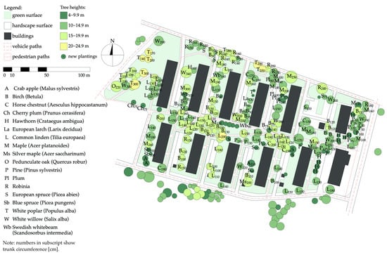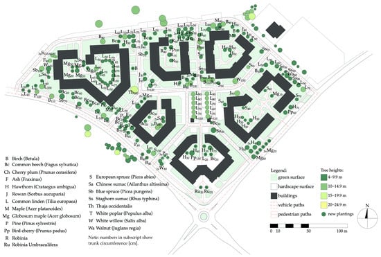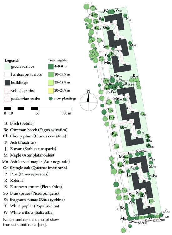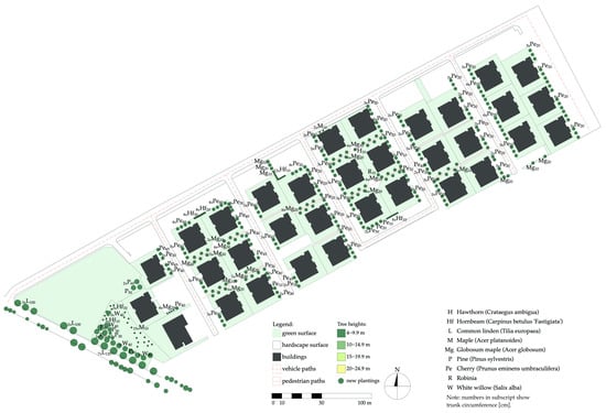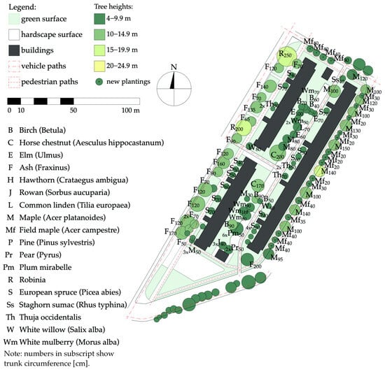 The materials used in the research included maps obtained from the spatial information system of the Poznań metropolitan area [72]. This resource allowed the generation of updated and scaled maps, which were imported into CAD software (ArchiCAD 24 EDU). Subsequently, the greenery was inventoried and marked on the maps according to the existing state. This step used the imagery provided by Google Maps and Google Street View, Poland’s online tree information service [73], site visits, and inventories.