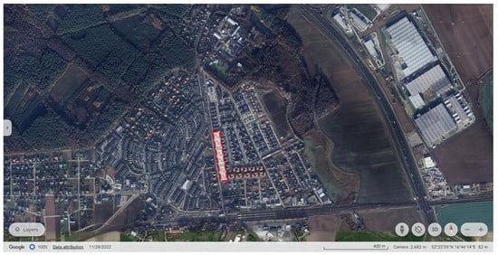 The residential estate located at Kolejowa Street (Figure 8 and Figure 9) in Dąbrówka near Poznań is the oldest part of a large-scale investment that is still under development. Because the residential blocks’ layout and design have changed over the past two decades, this study considers only the oldest part of the district, constructed in about the year 2000. This stage consists of repetitive layouts of three L- and Z-shaped low-rise buildings with sloped roofs. The buildings only have two stories, and one of the main assumptions of the concept was the direct access to the garden. The district has a fenced common area with a private access road and parking lots.