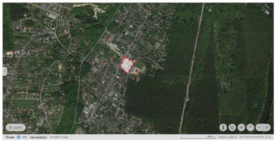 Location of the Kolejowa housing district in Dąbrówka (red frame). Map source: Google Earth [76].