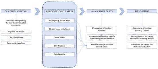 Each of the six case studies (estates) was drafted using CAD software and based on available maps (see Section 2). The settlements analyzed have different typologies and scales. For this reason, a set of indicators had to be calculated to objectively compare selected planning models regarding sustainability, here measured through standards of greenery content. The proposed method combines five indicators grounded in the existing state of knowledge, as explained below separately for each of them. The novelty of our approach lies in their joint application. In its integrity, the proposed methodology is used for the first time in this work. The methodological framework of the study is presented in Figure 14.