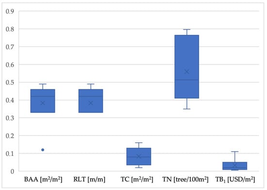 The measurement of the share of communication routes with strips of trees and tall bushes was proposed by Degórski and others [66] as an indicator of ecosystem services in urbanized areas. However, this indicator was initially intended for large-scale analysis and comparing districts, cities, and even metropolitan areas. Therefore, it does not include small greenery patches in residential areas and street sections shorter than 50 m.