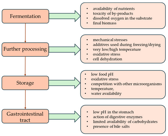 Factors affecting the viability of probiotics during production, storage, consumption, and until arrival in the large intestine [38,39].