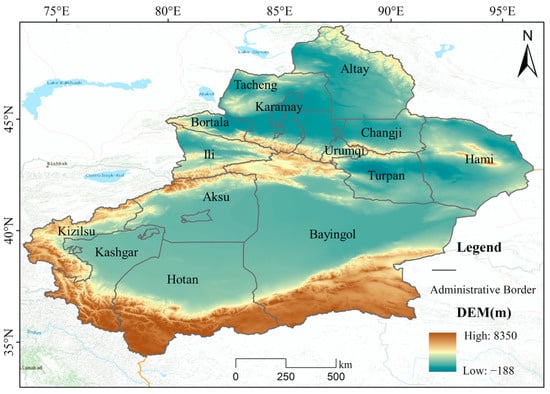 Elevated regions receive more solar radiation than lower regions, but building PV power plants in elevated regions costs a lot [34]. The elevation of the earth’s surface can be represented using the digital elevation model (DEM). So, this study selected the DEM of Xinjiang (in 2015) as the criteria.