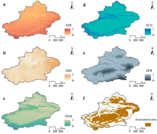Normalization of indicators. (a) Normalization of ASR. The solar radiation dataset was obtained from the website https://data.tpdc.ac.cn/ (accessed on 20 October 2023). (b) Normalization of SSD. The sunshine duration dataset was obtained from the website www.gis5g.com (accessed on 22 October 2023). (c) Normalization of DEM. The DEM dataset was obtained from the website http://earth.jaxa.jp/en/ (accessed on 21 November 2023). (d) Normalization of SLO. (e) Normalization of DFR. The roads dataset was obtained from the website https://www.openstreetmap.org (accessed on 21 December 2023). (f) Definition of the assessment area.