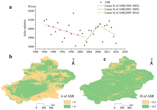 The spatiotemporal variation in annual solar radiation in Xinjiang between 1984 and 2016 was investigated. The linear fit of ASR (Figure 3a) shows that the overall solar radiation demonstrated a decreasing trend, with a decrease of 253.33 MJ/m2 during the study period. In addition, taking 2002 and 2009 as the interval points, through fitting analysis, it was found that solar radiation only increased significantly during 2002–2009, with an increase of 237.87 MJ/m2, at an average annual increase rate of 33.98 MJ/m2/year. The solar radiation in the other two time periods decreased significantly. In 2009–2016, the average annual decline rate of solar radiation was 1.8 times that in the period 1984–2002, and the solar radiation decreased by 216.18 and 275.02 MJ/m2, respectively. However, Xinjiang’s solar radiation was still at a high level. The main causes of the solar radiation variations in Xinjiang were the changes in cloud coverage, aerosol optical depth (AOD), and water vapor content [48,49]. Figure 3b shows the trends of total solar radiation in Xinjiang from 1984 to 2016. During the study period, approximately 45.81% of Xinjiang had a negative growth in solar radiation (k < 0), which were generally high-altitude areas. The other areas (approximately 54.19%) had experienced positive growth in solar radiation for the past 33 years. The future trends in solar radiation in most areas of Xinjiang were similar to the past (H > 0.5). This means that future trends for more than 90% of areas remained as they had been in 1984–2016 (Figure 3c). Only a small number of regions had a future trend that was opposite to their past trends (H < 0.5), and these regions were largely concentrated in northern Xinjiang. This may be due to the fact that the climate in northern Xinjiang has become very different from that of the last 30 years [50].