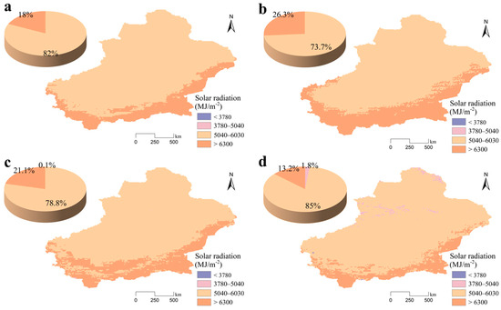 The average solar radiation (1984–2016) in Xinjiang is shown in Figure 4a. The average shows that most of Xinjiang has a high level of solar radiation (5040 MJ/m2 < solar radiation < 6300 MJ/m2). Only about 18% of the area is exposed to extremely high levels of radiation (solar radiation > 6300 MJ/m2). Extremely high solar radiation areas are mainly concentrated around the Kunlun Mountains in southern Xinjiang, mainly due to the area’s low latitude and high altitude. Figure 4b shows that the average solar radiation for the whole of Xinjiang in 1984 exceeded 5040 MJ/m2. The proportion of the Kunlun Mountains in southern Xinjiang with extremely high solar radiation levels reached 26.3% of the whole region. However, the area with extremely high solar radiation levels decreased to 21.1% in 2000 (Figure 4c). The area with extremely high solar radiation decreased by approximately 8.87 × 1010 m2. At the same time, a relatively high solar radiation area of approximately 8.8 × 108 m2 was observed (3780 MJ/m2 < solar radiation < 5040 MJ/m2) in central Xinjiang. Figure 4d shows that the area of relatively high solar radiation in northern Xinjiang gradually expanded, in 2016 to 3.12 × 1010 m2, which is approximately 1.8% of the total area of Xinjiang. In the same year, areas with low levels of solar radiation appeared, accounting for less than 0.1% of the total area of Xinjiang. Areas with solar radiation below 5040 MJ/m2 were largely concentrated in the Altai Mountains and the Tien Shan.