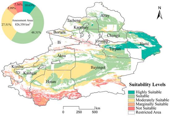 The suitability assessment was used to analyze and calculate the different suitable levels of the total area. This study only assessed areas of bare land, known as assessment areas. Other areas were collectively referred to as restricted areas. The total surface area of the restricted areas was 826,358 km2, which is approximately 50% of the total area of Xinjiang.