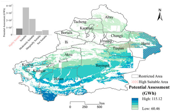 The PV power generation potential was investigated, and the total PV power generation potential of different suitability levels is summarized in Figure 6. In addition, this study focused on analyzing the prospects for PV power generation in highly suitable areas.