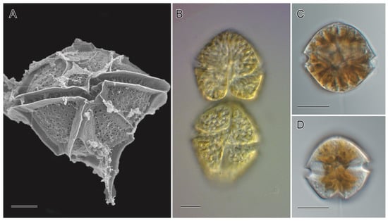 Cyst-forming PSP causative organisms in the Philippines: (A) Pyrodinium bahamense L. Plate, (B) Gymnodinium catenatum Graham, (C,D) Alexandrium spp. Halim. (A). SEM micrograph captured using S-4800 SEM (JEOL, Tokyo, Japan) (B–D). Light micrographs captured using a BX60 (Olympus, Tokyo, Japan). Scale bar = 10 µm.