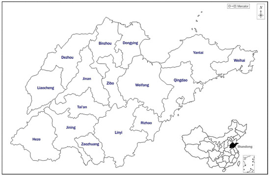 | Jinan | Qingdao | Zibo | Zaozhuang | Dongying | Yantai | Weifang | Jining | Taian | Weihai | Rizhao | Linyi | Dezhou | Liaocheng | Binzhou | Heze | |