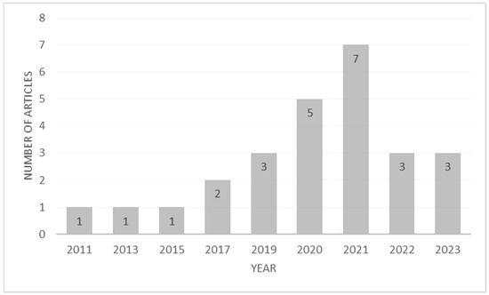 The systematic literature review begins by analyzing the time frame of the articles published on the given selection criteria. The time frame limitation was not set as an article selection criterion, as sustainable place branding is newly emerging in the academic literature. From the search results, it can be concluded that the earliest study on these concepts dates back to 2011, with pioneering research by Chen et al. on “The destination competitiveness of Kinmen’s tourism industry: exploring the interrelationships between tourist perceptions, service performance, customer satisfaction, and sustainable tourism” [47] in Journal of Sustainable Tourism. The study concepts have gained popularity since 2019, with most of the studies published in 2021, as shown in Figure 2. One of the major reasons for the spike in publications on sustainable place branding and the visitors’ responses can be attributed to increasing attention and investments in sustainable tourism destinations around the world [32]. These destinations still have to remain competitive, sustaining high visitor satisfaction and willingness to visit. In this context, academics and practitioners, including destination marketing and management organizations, are increasingly interested in understanding visitors’ interest and motivation to visit sustainable destinations, which has resulted in an increased number of studies on these concepts.