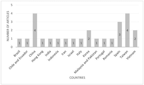 The literature analysis revealed that the majority of the articles on sustainable destination branding and visitors’ responses originated from China (15% of the articles), Taiwan (15% of the articles), and Spain (12% of the articles), among other South American, Asian, Middle-East and European countries (Figure 4). It is known that sustainable tourism and, therefore, research on sustainable destinations does not have a geographical scope; instead, a wide range of countries from various social, economic, and socio-ecological backgrounds [9] engage in sustainable tourism activities, also reflected in the distribution of the sourced articles for this study.