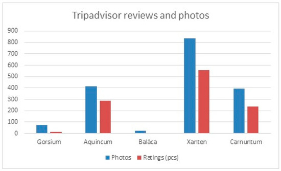 Visitors are also keen to illustrate their textual opinions by uploading their own photographs. In terms of visitor activity in this area, the Xanten Archaeological Park received the highest number of text reviews and photo uploads, with twice as many entries for each of these as for Aquincum, as shown in Figure 2. Aquincum Archaeological Park received slightly more reviews than Carnuntum Archaeological Park. Gorsium and Baláca have a low number of entries.
