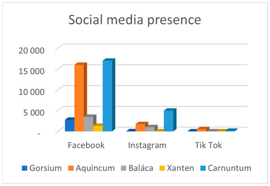 In our research, we also examined the social media presence of the archaeological parks studied, as one of the most important platforms of the online space. Facebook is the dominant social media platform, with each archaeological park having its own account. Interestingly, Xanten has a very low number of followers in this respect, while Aquincum and Carnuntum have between 16 and 17 thousand followers. The use of Instagram and TikTok is not significant, and Xanten does not even have a presence on these sites, as shown in Figure 4. The presence of other archaeological parks is not very strong either, but a sufficient number of users display each site to justify their stay there.