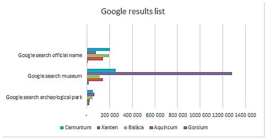 Finally, we also examined the Google results list, which gave different results for different search terms. The largest number of results for each of the locations tested was obtained by typing the word location + museum, which in the case of Xanten yielded more than 1,200,000 results; Figure 5 illustrates this outlier. Entering the official name was significant only for Aquincum and Baláca, while Gorsium was the only one where the word archaeological park was the most searched for this attraction. This is certainly important information for search engine optimisation, as with the right settings, online access to archaeological parks can be significantly increased.