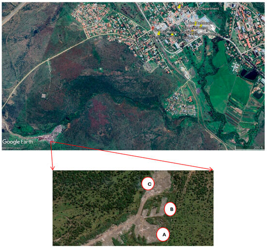 The study area map depicts the Alice region at a scale of 700 m, highlighting the location of the Alice landfill site along with three designated collection points labeled as A, B, and C. (www.googleearth.com, accessed on 18 January 2024).