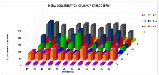 The results for the determined trace elements are presented in Table 1 and graphically in Figure 2. Ten trace metals were measured in Acacia karroo samples collected in polluted and unpolluted areas. The concentrations measured in parts per million (ppm) of trace elements varied from one site to another. Their concentrations (overall mean and standard deviation) were ranked in the following sequence: Sr (134.24 ± 19.22 ppm) > Zn (104.70 ± 47.74 ppm) > Cr (70.00 ± 17.48 ppm) > V (69.90 ± 14.87 ppm) > Rb (62.31 ± 9.09 ppm) > Cu (57.93 ± 32.16 ppm) > Ni (22.73 ± 7.96 ppm) > Y (22.20 ± 2.75 ppm) > Sc (11.52 ± 1.12 ppm) > Co (11.30 ± 2.58 ppm). The highest concentration levels of these metallic elements were recorded at site B (a polluted site) as follows: Sr = 154.82 ppm, Zn = 145.58 ppm, Cu = 126.97 ppm, Rb = 73.60 ppm, and Y = 23.64 ppm. Meanwhile, unpolluted site D was found to contain high concentration levels of these elements: Cr = 103.71 ppm, V = 103.24 ppm, Ni = 40.62 ppm, Sc = 13.46 ppm, and Co = 15.08 ppm.
