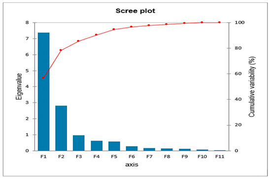 The results in Table 3 indicate two component factors with eigenvalues greater than >1, suggesting a two-factor solution (F1 = 6.67 and F2 = 1.96). Thus, these two factors were selected for further analysis. The other small eigenvalue of less than <1 was not utilized to estimate the probable number of contributing source factors. This reveals that the first two principal components (F1 and F2) are the most accurate options, as confirmed by the scree plot, which shows an elbow-shaped graph after the second component (Figure 3). Many recent researchers have endorsed and projected that the findings of the first two principal components (F1 and F2) are adequate to represent the entire dataset information, accounting for a total percentage of variance exceeding 70%, which signifies the overall inertia [32,33]. The first principal component (F1) contains the greatest variance values (66.70%), with maximum loadings of Sc, V, Zn, Rb, Cr, Co, Ni, Sr, and Y. This indicates a high concentration of heavy metals as pollutants in Acacia karoo leaves, suggesting that these elements may originate from the same sources. The second principal component (F2) accounts for 19.59% of the variance, with high loadings of Sc, Ni, Cu, and Zn, suggesting the dominance of essential elements supplied by the soil for plant development or growth. Despite the lack of knowledge regarding Sc’s biological function in plants, Table 1 shows that its concentration is minimal. The fact that the rule states that there is a substantial amount of Sc on plant roots suggests that the Sc value in the soil does not bioaccumulate in plant tissue [34]. The first two principal components account for a cumulative variance contribution of 84.28%, explaining a total variance of 84% with strong correlations to the identified elements.