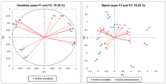 Diagram of the principal components F1 and F2 for trace elements and enzyme activity.