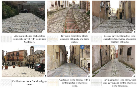 Examples of paving in the historic center of Piana Degli Albanesi (PA). Note the use of traditional materials (19th century and later) and workmanship and textures suitable for the conditions of use, e.g., non-slip finishes for steep slopes (Image processed by Architect Giuseppa Nocera).