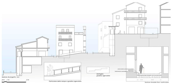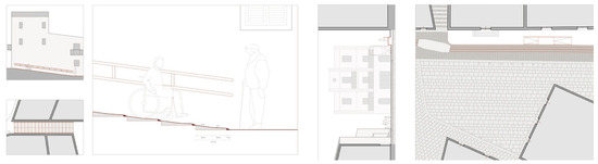 An assisted route within the historic center has been provided to ensure accessibility for people who are elderly, disabled, or have children in prams in areas where there are steep slopes or stepped ramps. In particular, in spaces where there are differences in height of more than three meters, it is foreseen that outdoor lifts will be placed within abandoned sites. Meanwhile, ramps and stairways with moderate height differences have been redesigned as easy-step ramps that can also be used by wheelchair users (Figure 6).