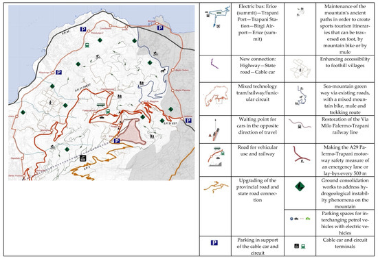 Proposed sustainable territorial road system. On the right side is a list of the strategic actions intended to improve links between the center of Erice and the surrounding area, i.e., by sea, airport, station, city of Trapani (Image prepared by Arch. Chiara Maria Stabile).