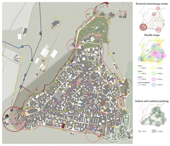 Proposed sustainable road system in the city center. Depicted are the intermodal parking areas adjacent to the old city walls for wheelchair and mobility scooter users, as well as the stops and the radii of influence of public transport lines (Image prepared by Arch. Chiara Maria Stabile).