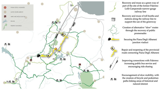 The road network in the historic center was assessed with the aims of recovering urban identity and guaranteeing the accessibility of space. It was then re-evaluated in order to subdivide routes according to their physical features (gradients and road sections). Exclusively pedestrian routes, driveways suitable for small vehicles, and local roads outside the historic center were envisioned. The actions envisaged [26] in the area (Figure 5) aim at a reorganization of mobility and both a link between and enhancement of the natural and cultural heritage through the repair and reopening of provincial roads and the improvement of links with the Sicilian capital, Palermo, by providing for the use of electric buses and encouraging of ride sharing. The plan also envisages the construction of bicycle and pedestrian paths that connect areas of historical and natural interest, through the recovery of state-owned tracks and the reclamation and reuse of parts of the former railway line as a greenway.