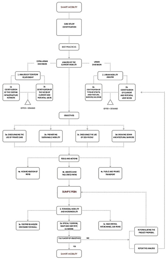 A comparison with national and European best practices has made it possible to identify strategic actions and plan interventions as operational tools for planning, both at different scales and for urban design, i.e., combined public/private transport scenarios, the identification and selection of urban routes to make them accessible and assisted, and the development of elements for a combined plan for sustainable urban mobility (SUMP), as well as the elimination of architectural barriers (PEBA, from Italian: Piano Eliminazione Barriere Architettoniche).