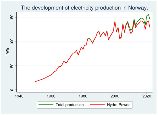 Norway’s high mountains and location along the rainy west coast of Eurasia make it an ideal setting for hydropower production [9]. The first hydropower plants were constructed in the 1880s [10,11], and as of February 2023, there were 1761 operational power plants. As illustrated in Figure 1, there has been a significant increase in power production since 1950. Since production is weather-dependent, annual output fluctuates. In 2021, Norway achieved its highest ever production at 157 TWh. The average production from 2018 to 2022 was 148 TWh [12].