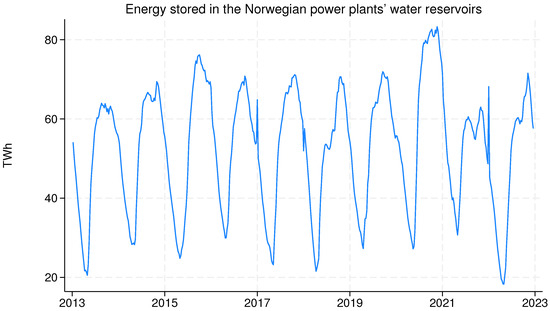 Energy stored in the Norwegian power plants’ water reservoirs measured in TWh. The water reservoirs of power plants are at their lowest in the spring before snowmelt leads to the inflow of water being higher than what is used for production. The highest level is in the fall before precipitation comes as snow.