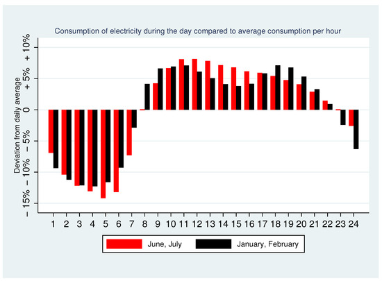 Electricity consumption exhibits three primary patterns of fluctuation: daily, weekly, and yearly. Figure 3 illustrates the daily consumption patterns in relation to the average. There is a notable variation in these patterns between summer and winter. During winter, the lowest electricity usage typically occurs between 2–3 a.m., peaking between 4–5 p.m. In contrast, summer consumption reaches its lowest between 3–4 a.m., with the highest demand occurring between 10–11 a.m.