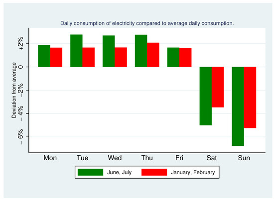 Figure 4 illustrates the weekly pattern of electricity consumption. In this depiction, the average consumption on each day is compared to the overall average daily consumption for the week. Notably, Saturdays and Sundays experience the lowest levels of electricity use. However, the disparity between normal weekdays and the weekend (Saturday/Sunday) is more pronounced in summer than in winter, highlighting a clear variation in consumption patterns between these seasons.