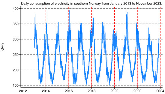 Cultural, climatic, and economic conditions influence the consumption of electricity from hour to hour with remarkable pattern stability over time. Figure 6 shows the daily consumption over the year from and including January 2013 to January 2023. From the figure, we see that consumption over the year fluctuates as a stationary time series.