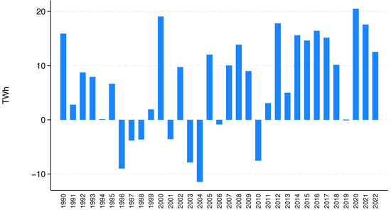 Usually, the production of electricity in Norway is greater than the consumption. As Figure 8 shows, in 23 of the 32 years from the year 1990 to the year 2022 the hydropower production in Norway was larger than the consumption of electricity. In the period 2000–2022, the total net export of electricity from Norway to other northern European countries was 191 TWh [24].