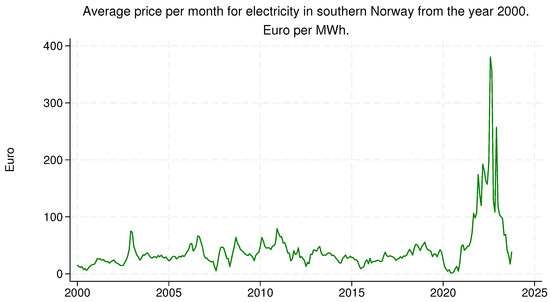 Figure 10 presents the electricity prices in southern Norway () measured in euros since the year 2000. The data reveal that from 2000 to 2020, the prices remained relatively stable and low. During the period of 2013 to 2020, the average price was around NOK 286 per MWh. However, a dramatic increase occurred in the autumn of 2020, with prices peaking at NOK 7820 (approximately EUR 780) on 30 August 2022. Such significant fluctuations in the price of a necessity like electricity are quite rare.