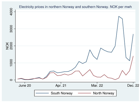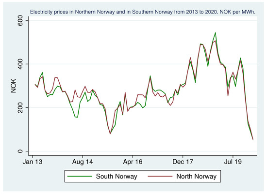 The special feature of the electricity market is that production must at all times be equal to consumption. That is to say, the market must balance. To make it easier to balance the market, five price areas have been created for electricity. The areas No1, No2, and No5 are in southern Norway, while No3 and No4 are in northern Norway [25]. In practice, we have seen that there is little price difference between the three price areas in southern Norway (No1, No2, and No5) and the two price areas in northern Norway (No3 and No4). Therefore, in this article we will combine the price areas in the south and in the north and refer to these as price in southern Norway () and price in northern Norway (), respectively. If is the electricity price in area i we have:
