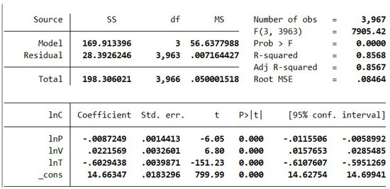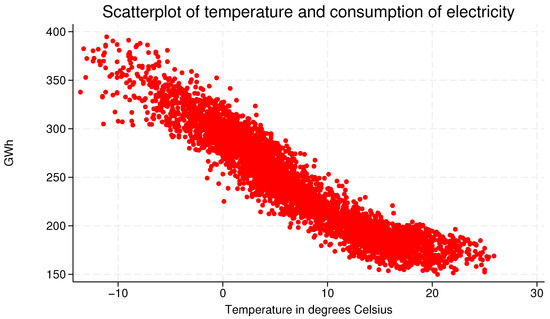 where P is price of electricity in southern Norway, T is temperature measured in Fahrenheit (to be able to use logarithms), V is wind speed and A, , , and are positive constants. Equation (1) is a special case of a Cobb–Douglas function. When conducting a regression analysis, choosing a model can be problematic, but from Figure 13, there is reason to believe that the relationship indicated in (1) fits well in our case.