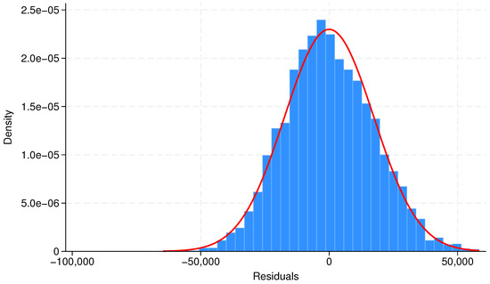 - Normality of the residuals test: Our case does not satisfy the requirement for the residuals to be normally distributed. In our situation, we have observations for all variables—the dependent and the three independent ones—over 3970 days. Based on the Central Limit Theorem, we therefore choose to assert that the results we have arrived at are valid [38]. This is also confirmed by Figure 18.