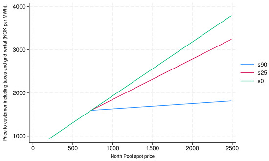 The authorities introduced electricity support for consumers’ residential consumption in December 2021. Residential homes use 24.8 percent of the electricity produced in Norway (based on average consumption and production in the years 2021, 2022, and 2023) [39]. The price that consumers pay is the Nord Pool spot price plus taxes and value-added tax (VAT) and grid rental minus government support. The support amounts to 90 percent of the amount by which the price exceeds NOK 730 per MWh. Electricity support is given for consumption lower than 5000 kWh per month. Electricity support is not given for the consumption of electricity in holiday homes. Consumers must pay two types of taxes. There is the value-added tax of 25 percent. In addition, there is an extra tax of NOK 10 per MWh. In addition to this, consumers must pay grid rental. The grid rental consists of a fixed and a variable part. The average grid rental in 2024 is NOK 535.5 per MWh [40].
