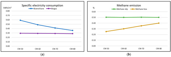 The electricity measurement results (Figure 2a) showed that the increasing methane concentration in the biogas did not influence the electricity consumption of the investigated biogas upgrading technology under the investigation conditions. The electricity consumption was relatively stable in all the experiments, showing a slightly decreasing tendency when considering specific electricity consumption. This consumption was 0.294 kWh per one Nm3 of raw biogas upgraded in experiment CM-50 and varied in other experiments in the range of 0.292–0.286 kWh per one Nm3 of raw biogas upgraded. It is in the range of a similar study on biogas upgrading [69]. However, the specific electricity consumption of FU (1 m3 of bioCH4 obtained from raw biogas) shows that electricity consumption decreased while the methane concentration (Figure 2b) in raw biogas increased. The reduction in specific electricity consumption was 17.3%, 15.0% and 13.5% in every next experiment: CM-60, CM-70 and CM-80, respectively. Such a decrease in electricity is a good sign because lower energy consumption for biomethane production positively impacts the environment and reduces global energy demand. An analysis of the literature on electricity consumption in biogas upgrading showed that there are several studies where authors investigate and compare the electricity consumption of different biogas upgrading technologies. L. Lombardi and G. Francini [70] performed a study on five biogas-to-biomethane upgrading technologies where electricity consumption was analysed: high-pressure water scrubbing, amine scrubbing, potassium carbonate scrubbing, pressure swing adsorption, and membrane permeation. The authors collected all the data for their study from real-scale biogas upgrading plants and calculated the specific electricity consumption related to 1 m3 of biogas. The results of membrane permeation technology were very similar to those of our investigation. According to the authors, 1 m3 of biogas upgraded requires 0.2–0.3 kWh of electricity at a methane slip of 0.5% and a methane concentration in biogas ~55%. Each year the mix of energy used for electricity production utilises an increasing amount renewable energy [71,72,73,74]. Therefore, the share of methane emissions from electricity production will decrease further. However, the results of the investigated biomethane production system are still very highly dependent on non-renewable energy sources.