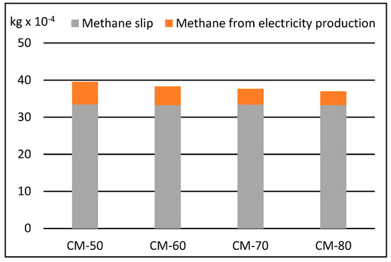 According to an inventory evaluation of LCA, the calculation of the cumulative methane emissions included methane slip and methane emissions from all the equipment manufacturing and energy production processes. Figure 3 illustrates the breakdown of methane losses at different methane concentrations in raw biogas.
