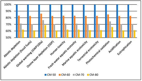 The inventory breakdown in every impact category of the CM-50 experiment can be seen in Figure 5a, and the inventory breakdown in every impact category of the CM-80 is depicted in Figure 5b.