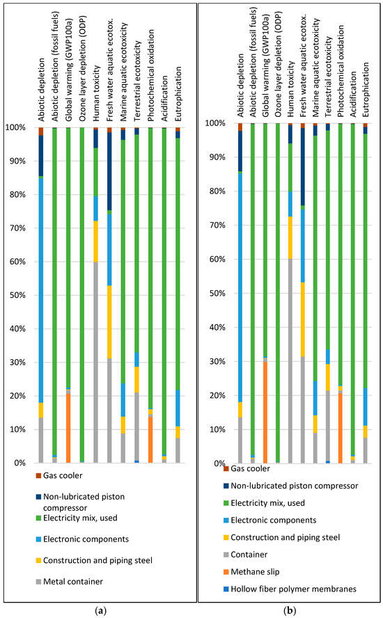 The results of the life cycle assessment in both experiments showed that for 8 out of the 11 analysed categories, the parameter of electricity consumed stood out significantly. The highest impact above 97% was found in the categories of abiotic depletion (fossil fuels), ozone layer depletion, and acidification. In the categories of global warming, marine aquatic ecotoxicity, terrestrial ecotoxicity, photochemical oxidation, and eutrophication, electricity impacts were a bit lower but varied between 60 and 80%. All those categories are subject to electricity produced from a large share of fossil fuels. C. Florio et al.‘s study on different biogas upgrading technologies [79] also concluded that for their investigated production system, despite even being based on biomass, the results are still very highly dependent on non-renewable energy sources. This is because biomass must be processed and transported to the destination points where it is used up, and these processes still require non-renewable energy. Although non-renewable sources are used, it is optimistic that the impact of electricity will decrease because an ongoing transfer from fossil fuels to renewable energy will mitigate the impact of electricity production in existing biogas upgrading systems [71]. Meanwhile, methane gas emitted into the atmosphere is the primary contributor in only two categories: global warming and photochemical oxidation, where electricity also plays a role. The results show that electricity and methane emissions acted in opposite directions, showing that electricity consumption for biogas upgrading relatively decreased, while methane slip increased when methane concentration in raw biogas rose. Despite the increase in methane slip, the total impact of both shares dropped in experiment CM-80, showing the positive impact of increasing methane concentration in raw biogas on global warming and photochemical oxidation categories for permeable membrane upgrading technology. The infrastructure (compressor, gas cooler, container, construction, piping steel, and electronic components) impacted with lowering tendencies on the impact categories because they were only related to rising methane concentrations in raw biogas. The most significant factor in the impact of the infrastructure came from the electronic components used for the manufacturing of biogas upgrading equipment.